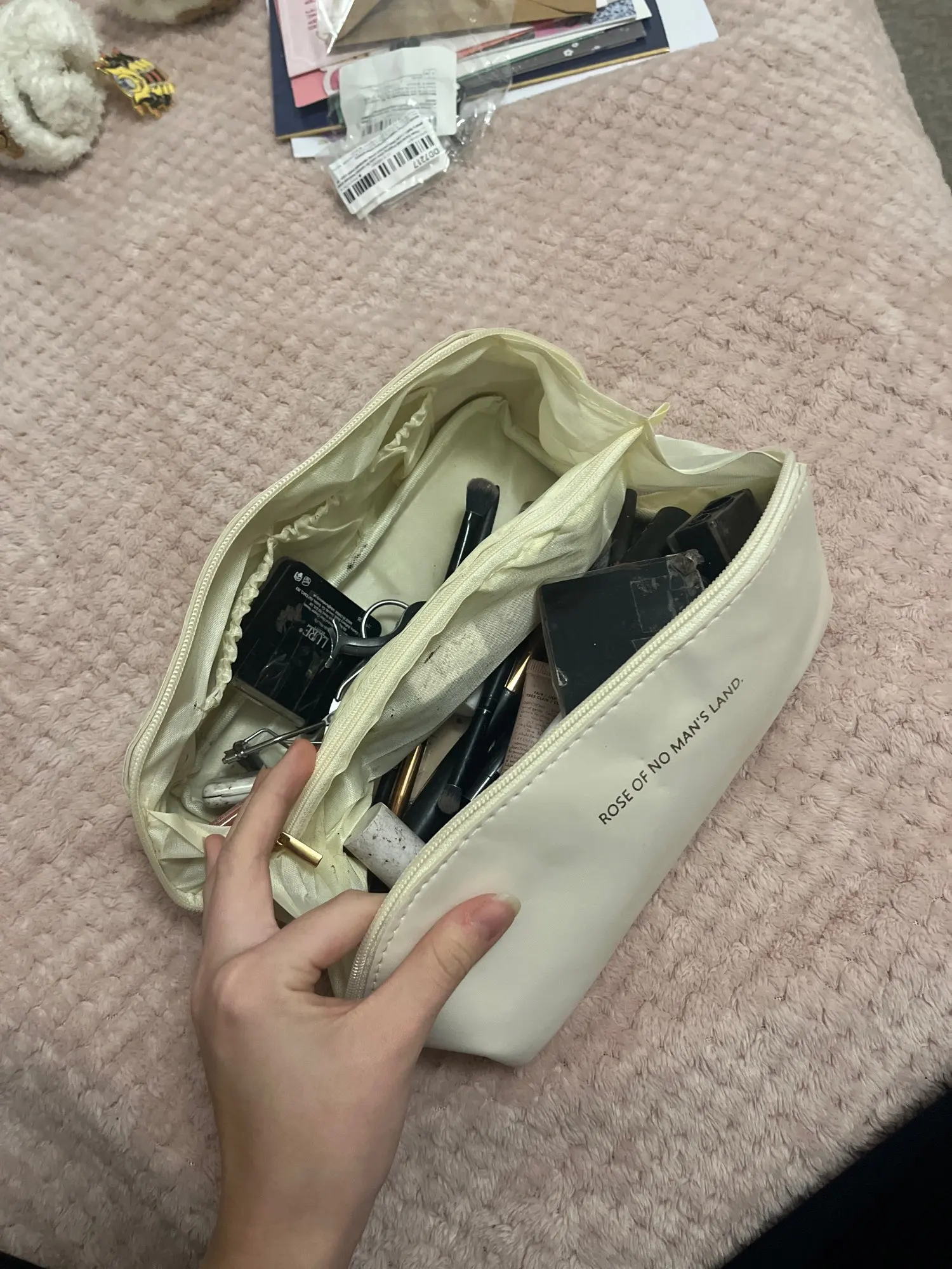 💡 Dica de Organização: "Use os bolsos laterais internos para guardar itens pequenos como pinças, batons e elásticos, deixando o espaço central livre para os frascos maiores."